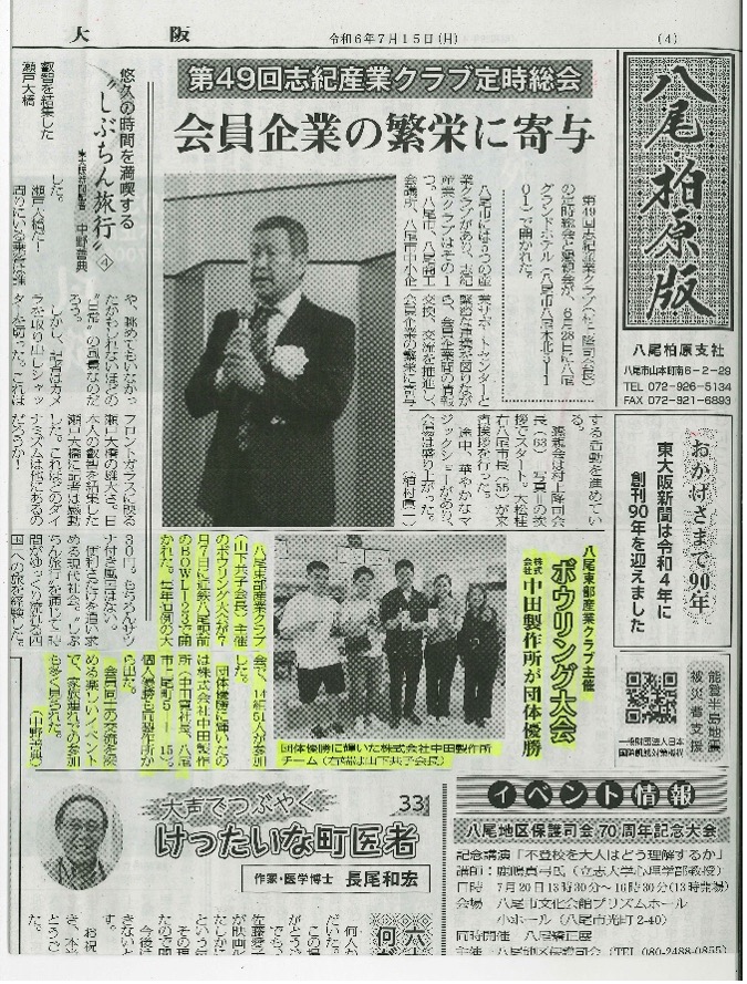 7月15日(月)に発刊されました東大阪新聞 八尾・柏原版にて、東部産業クラブ主催のボウリング大会で弊社が団体優勝したことを掲載して頂きました。